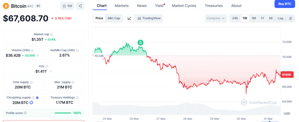 本周,比特币在66,000美元中段至67,000美元中段之间徘徊,反映了伊朗和美国事态的矛盾信号。投资者和交易员正密切关注地缘政治动态和即将发布的经济数据以评估风险,比特币充当了不确定性的指标,而非市场下一步走向的明确预测器。