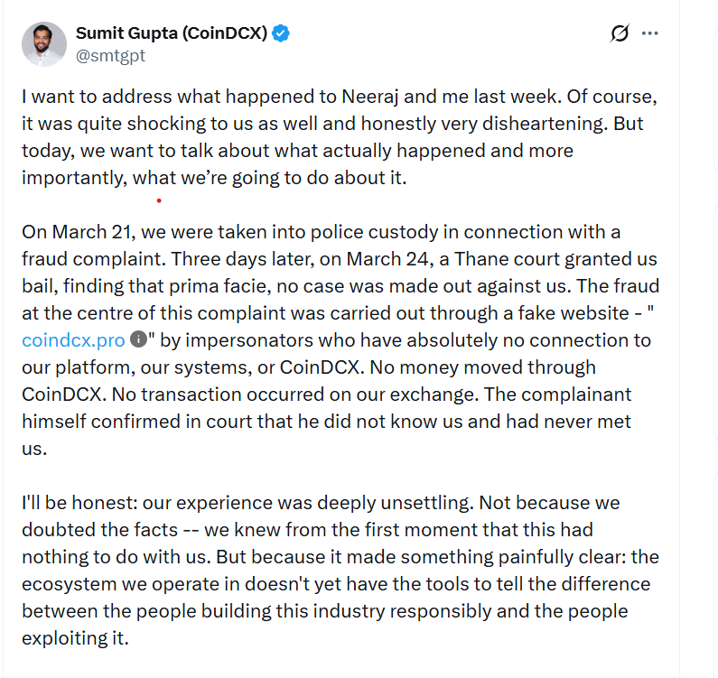 该计划由联合创始人兼首席执行官苏米特·古普塔于3月30日在X平台上发布。此前,古普塔与另一位联合创始人尼拉杰·坎德瓦尔因一起涉及假冒“CoinDCX Pro”网站的投诉于3月初被警方拘留,该网站骗走一名投资者约7.5万美元。