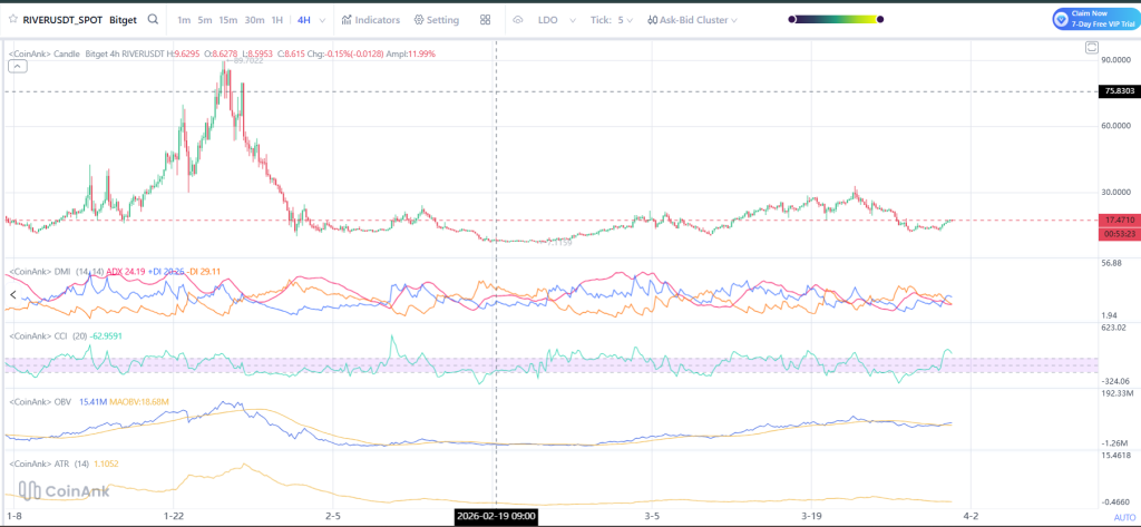 观察4小时图可见,River 的上涨并非无端爆发。在经历了长期下跌后,价格其实已缓慢复苏。此前 RIVER 价格在低位横盘整理了相当长时间,而后才重新开始上行。近期的这波上涨,更像是此前渐进复苏趋势的延续,而非全新的突破。