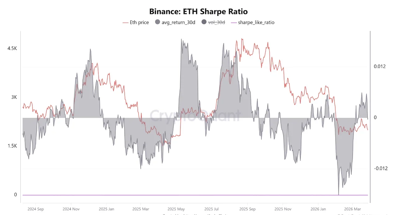 将视野放大到链上分析层面,CryptoQuant的数据描绘了一幅关于ETH作为过去一个月风险调整后持仓的、不那么乐观的图景。以太坊在币安上的30日平均回报率为−0.00039,由此得出的类似夏普比率已降至约−0.0012。