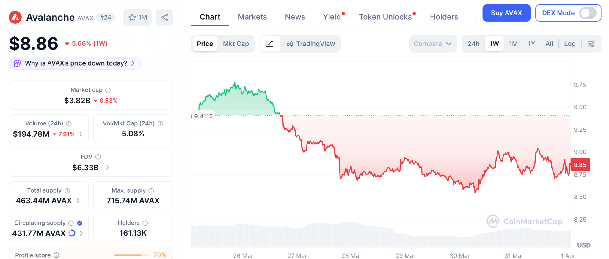 据CoinMarketCap数据,AVAX于3月31日报8.86美元,较峰值下跌90%。