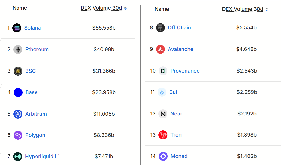 Solana网络手续费在3月降至1850万美元,较1月的3000万美元水平下降42%。此下滑主要源于去中心化交易所交易量的活跃度降低。据DefiLlama数据显示,尽管在绝对量上保持领先,Solana的DEX交易量已骤降至555亿美元,为2024年9月以来的最低水平。