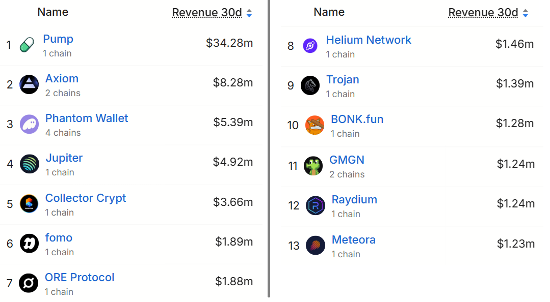 Solana以13个DApp在过去30天内收入超过百万美元的表现领先。相比之下,排名第二的以太坊有11个DApp,BNB链和Base网络则各有4个DApp实现月收入超百万美元。因此,几乎没有证据表明SOL价格会仅因DEX交易量疲软导致的网络手续费降低而必然重新测试75美元。