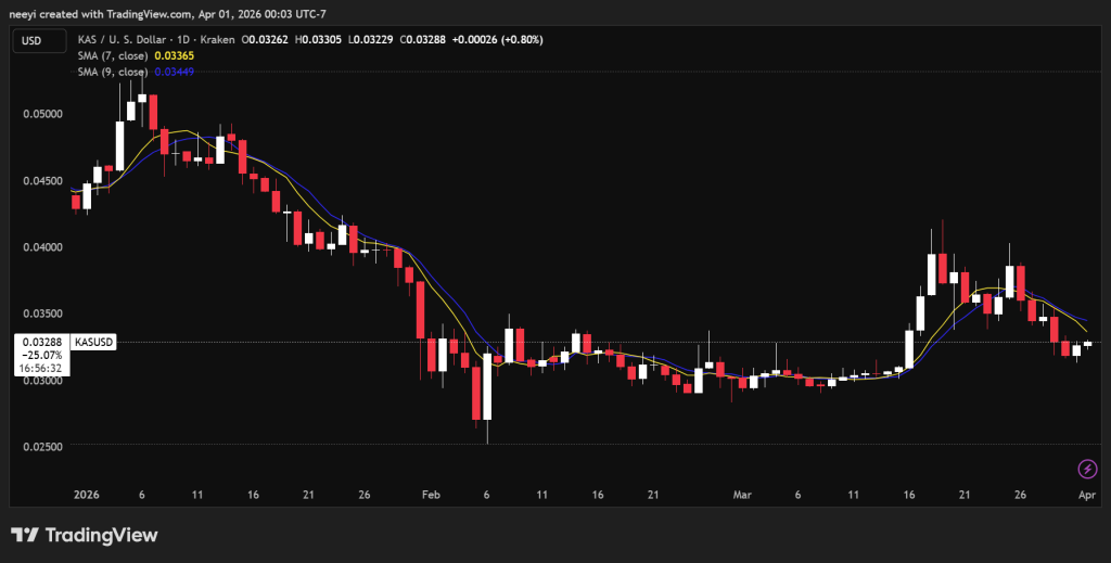 Kaspa在30日内仍保持着约10%的正向表现,中期结构尚属完整。然而近7日10%的跌幅,确证其已从三月高点明显回落。最新24小时2.91%的涨幅显示反弹迹象,但力度仍显有限。这种组合表明Kaspa尚未完全丧失上行结构,但短期压力依然可见。