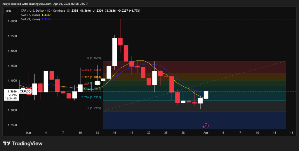 XRP摆动高点为$1.60,低点为$1.30。斐波那契阻力位分别位于$1.37与$1.42附近。当前价格接近$1.35,表明XRP处于支撑区域且仍位于深度回撤区间内。