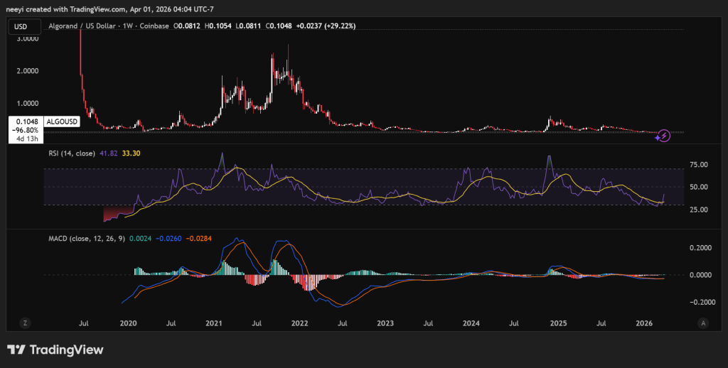 进入2026年4月,Algorand价格大幅上涨,这在近几个月表现低迷的市场中格外引人注目。就在几天前跌至约0.079美元后,ALGO价格现已攀升至约0.104美元。伴随这次反弹的是市场活动的急剧升温,这让这个长期承压的项目重回聚光灯下。