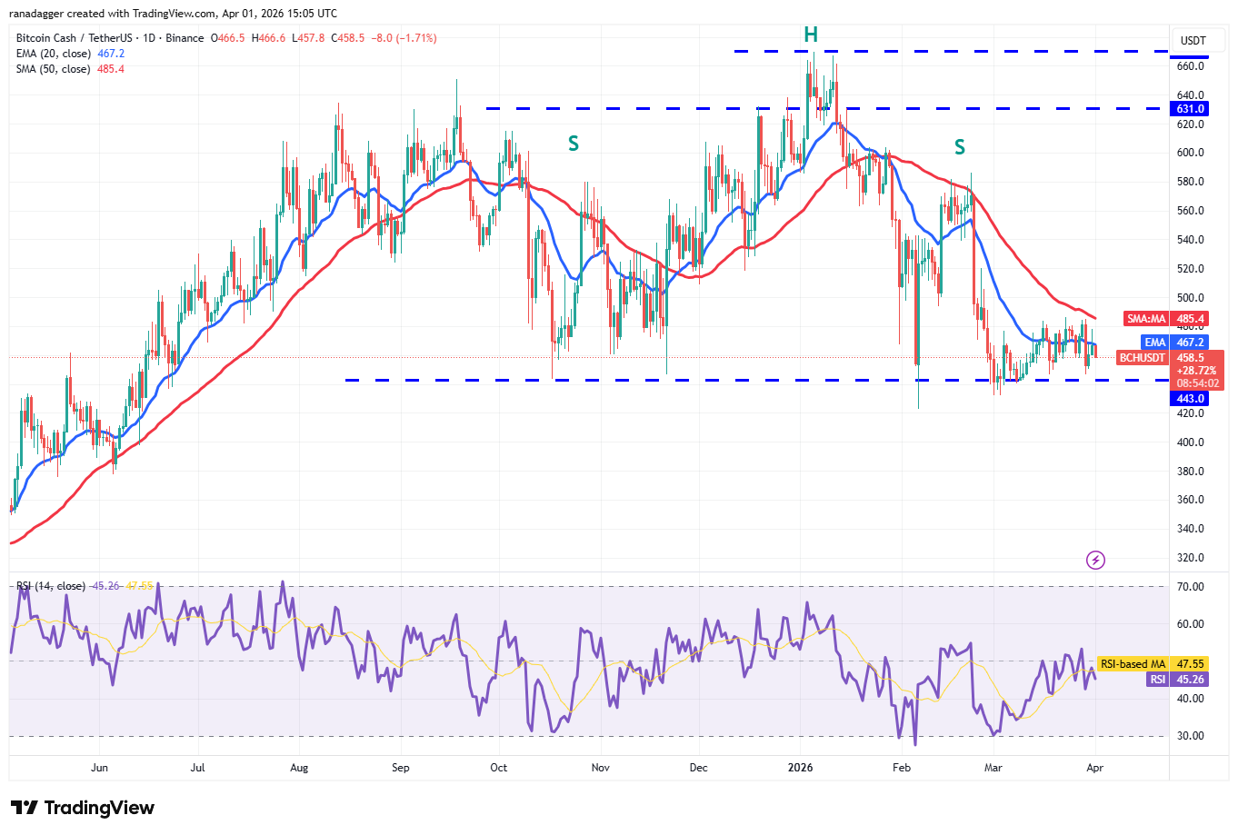 多头未能突破50日简单移动平均线表明空头在较高价位活跃。空头将试图通过将BCH价格拉低至443美元下方来巩固优势。若成功,BCH/USDT交易对将完成看跌的头肩顶形态,可能开启跌向375美元的通道。