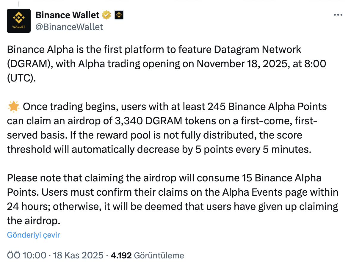 2025年11月18日,币安钱包部门Binance Wallet宣布数据链网络项目Datagram Network(DGRAM)正式登陆Binance Alpha平台。交易将于土耳其标准时间上午11:00开启,用户还可额外参与DGRAM空投活动。该公告标志着Binance Alpha成为首个上线DGRAM的交易平台。