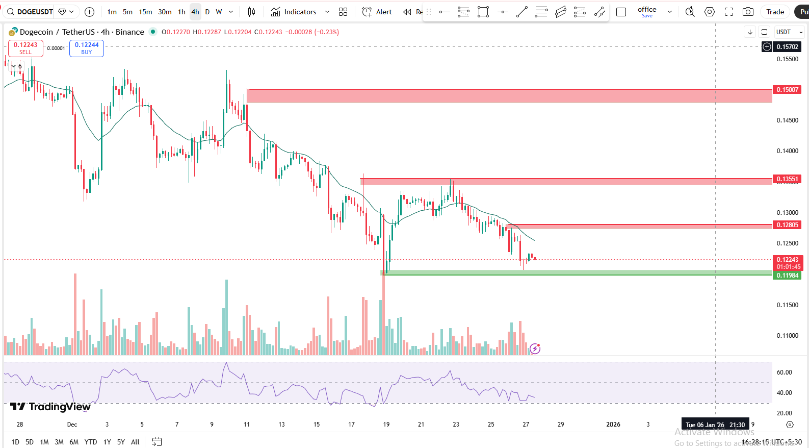 在4小时图上,DOGE坚守在0.120-0.122美元区间的支撑带,该区域已多次发挥支撑作用。价格仍处于阻力位下方,但已不再呈现急剧下跌趋势。