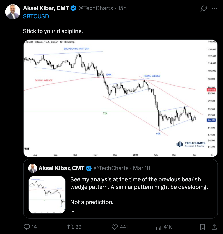 特许市场技术分析师阿克塞尔·基巴尔的分析预测价格可能下探52,500美元。其在3月18日的分析中指出:“跌破形态下边界将是可能跌向52,500美元的信号。”