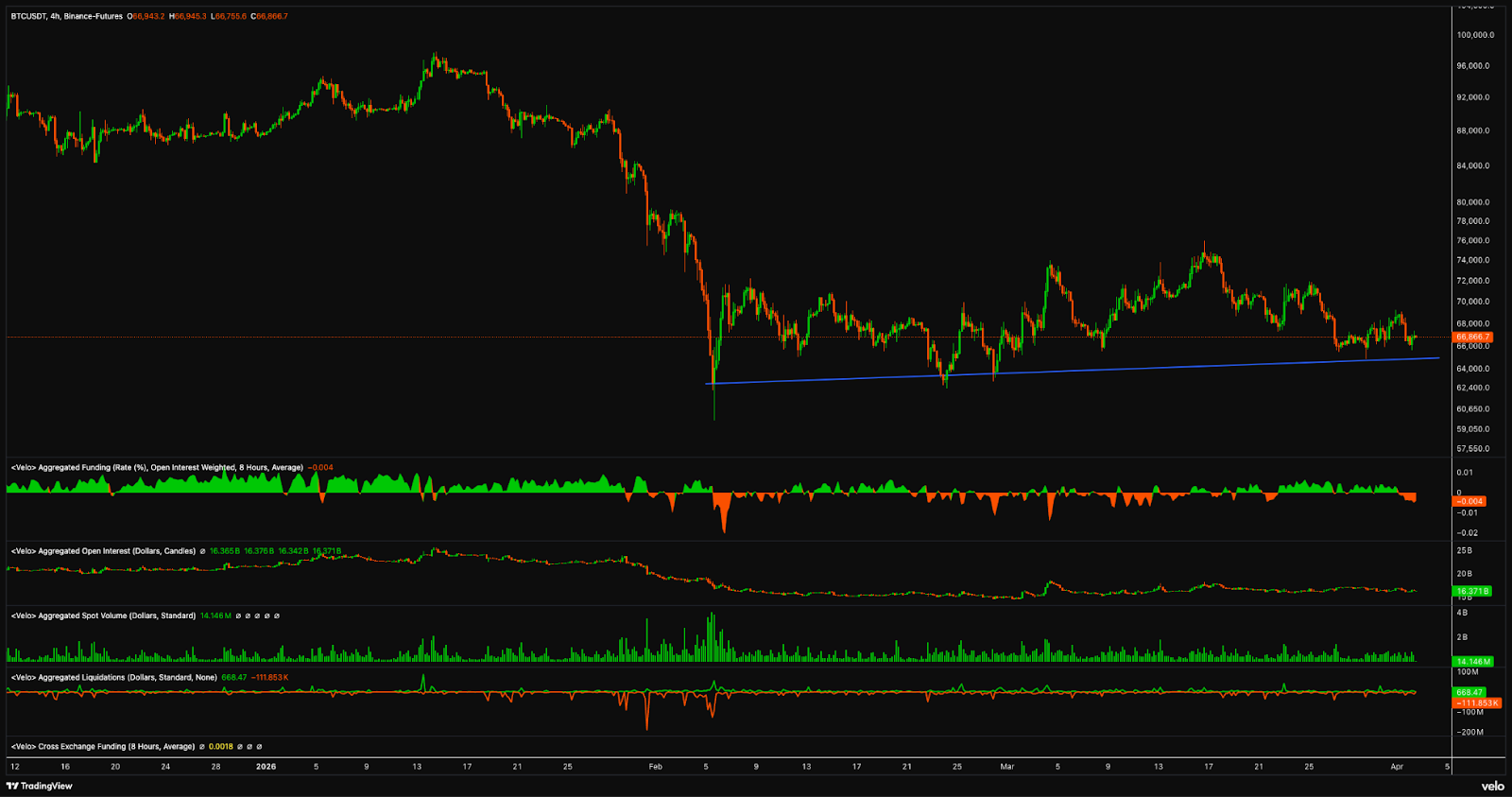 Velo数据显示,比特币现货与期货市场的整体需求相对平淡。尽管交易者似乎将BTC资金费率转负视为买入机会,但在价格反弹至看跌旗形趋势线阻力位时,他们的信心明显不足。比特币总未平仓合约持续低于200亿美元便是证明,此水平为2月2日以来最低,当时BTC交易价格接近79,000美元。