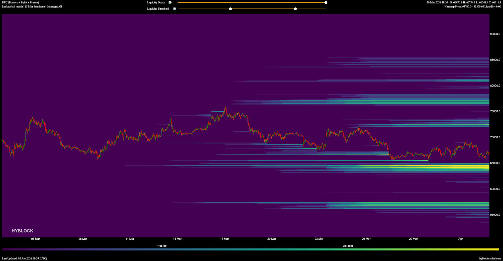 关于基巴尔52,500美元的预测与比特币期货市场的关联,Hyblock清算热图数据显示,若BTC跌入63,000至65,000美元区间,大量杠杆多仓将面临清算风险。其下方存在流动性缺口,直至57,500至56,000美元区间才有较多多头头寸分布。