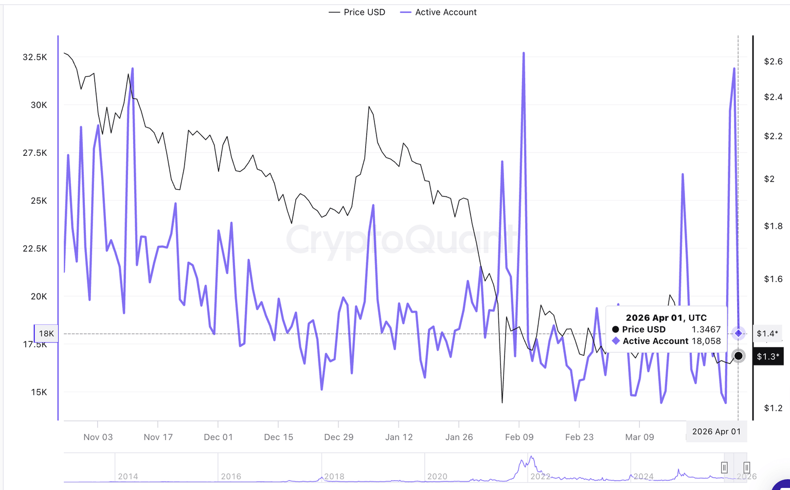 周三,XRP账本上的活跃钱包地址数从周二记录的近32,000个大幅收缩约42%,至约18,000个。CryptoQuant的信息显示,地址活跃度自二月初以来一直处于低迷状态,仅偶有短暂回升。