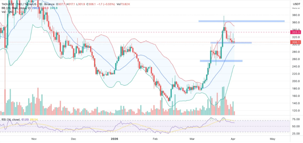 市场数据同时表明,交易者在回调期间保持活跃,通常反映吸筹行为。价格波动虽增大,但资产仍稳定在300美元附近。