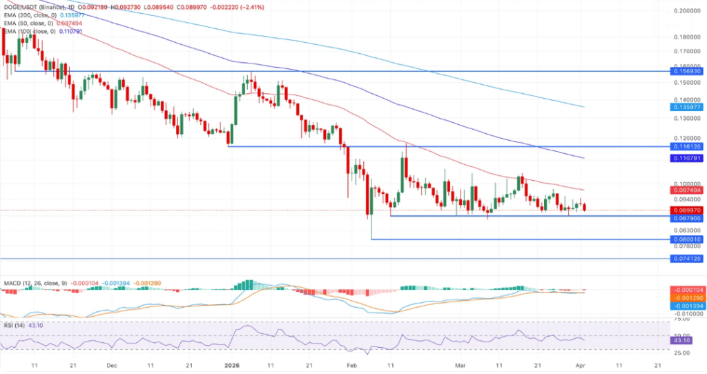 价格走势在0.0879美元支撑位上方徘徊,该位置正受到交易者密切关注。若确认跌破该区域,可能进一步下探2月初曾测试过的0.0800美元水平。此外,更深度的下跌或使0.0741美元支撑位重新成为焦点。