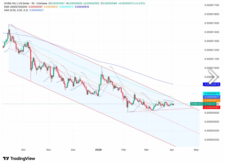 自2025年9月在0.000015美元附近见顶后形成的下降通道持续主导交易行为。通道上轨目前位于0.0000075美元附近,下轨则于四月期间逐步下探至0.0000040美元区间。
