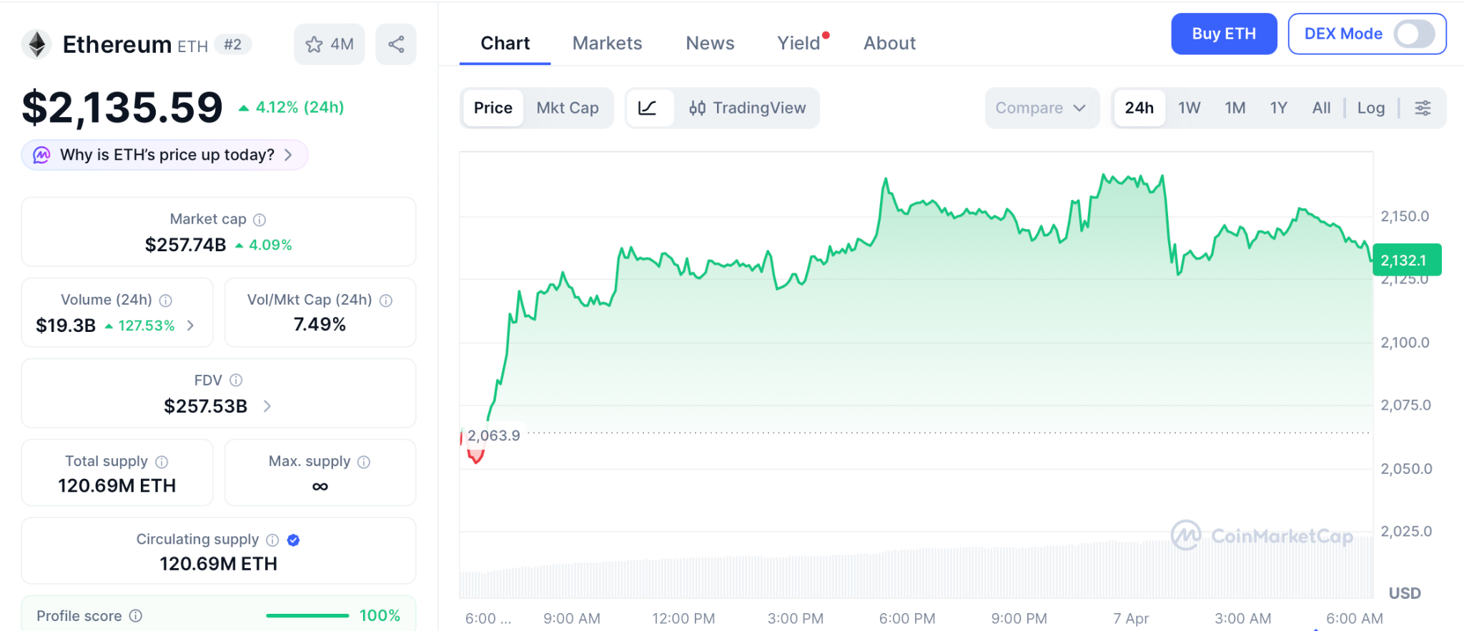 根据CoinMarketCap数据,ETH在2026年4月7日交易价格为2,100美元,仍比历史高点低57%。Bitmine持有480万枚代币显示出机构信心。