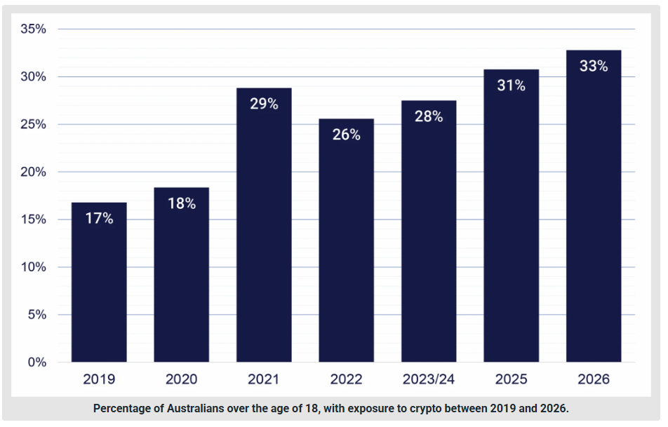 加密货币交易所Independent Reserve的加密指数显示,在超过2770万人口的澳大利亚,接触加密货币的人口比例已从2025年的31%升至33%。研究同时发现,与前一年相比,使用加密货币支付商品和服务的人群正在持续扩大。