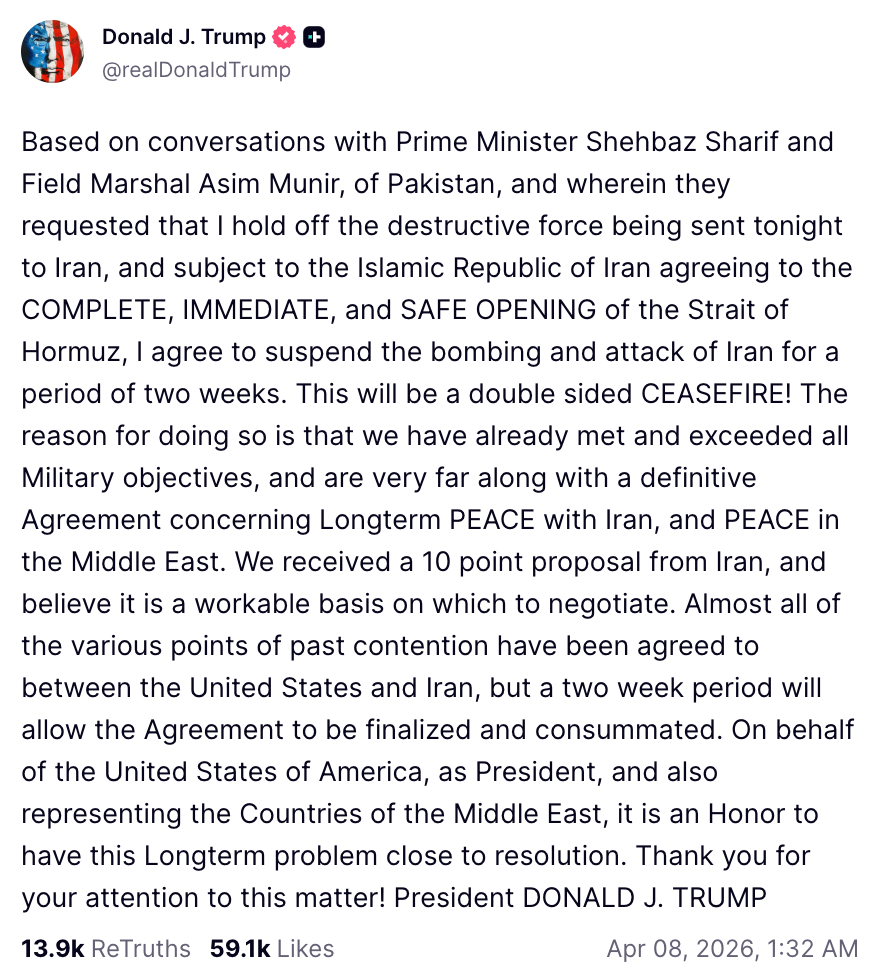 此次价格波动是对特朗普确认与伊朗达成两周停火协议的回应,该协议以“全面、立即、安全开放”霍尔木兹海峡为条件。