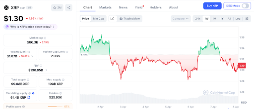 根据CoinMarketCap数据,截至4月8日,XRP交易价格接近1.30美元。TheStreet报道称,这是自2024年7月以来,首次有超过50%的流通供应量处于亏损状态。BNB刚刚从XRP手中夺回了市值第四的位置,而据OpenPR消息,渣打银行已将其2026年目标价从5.50美元下调至2.80美元。