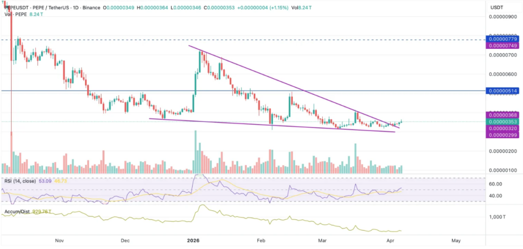 在经历了数月的下跌后,Pepe价格已趋于稳定,在0.0000029至0.0000032美元区间附近显示出韧性。此外,该代币日内涨幅近6%,同时交易量急剧上升,表明市场活动重新活跃。然而,整体结构仍受到下行趋势线的压制,该趋势线持续限制价格上涨动能。