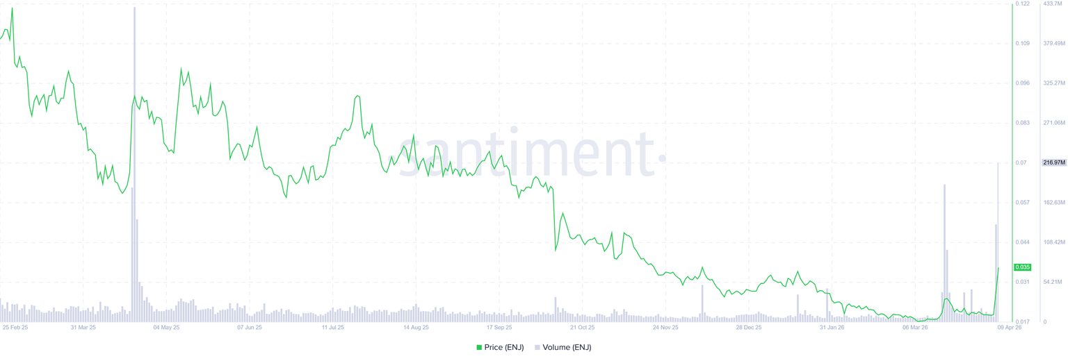 交易量指标生动描绘了市场活动的加剧。根据Santiment的生态系统数据,ENJ在周四录得2.1697亿美元的交易量——这是自2025年4月以来的最高记录。与此同时,MEXC交易所数据显示,其24小时交易量达1.057亿美元,而ENJ的市值约为5780万美元。