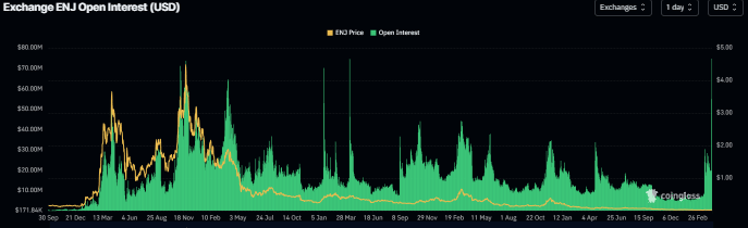 衍生品市场数据进一步证实了看涨情绪。根据CoinGlass的追踪数据,ENJ期货的未平仓合约在周四飙升至7468万美元,较周二记录的1982万美元大幅增加。未平仓合约的扩张表明有新的资金流入ENJ头寸。