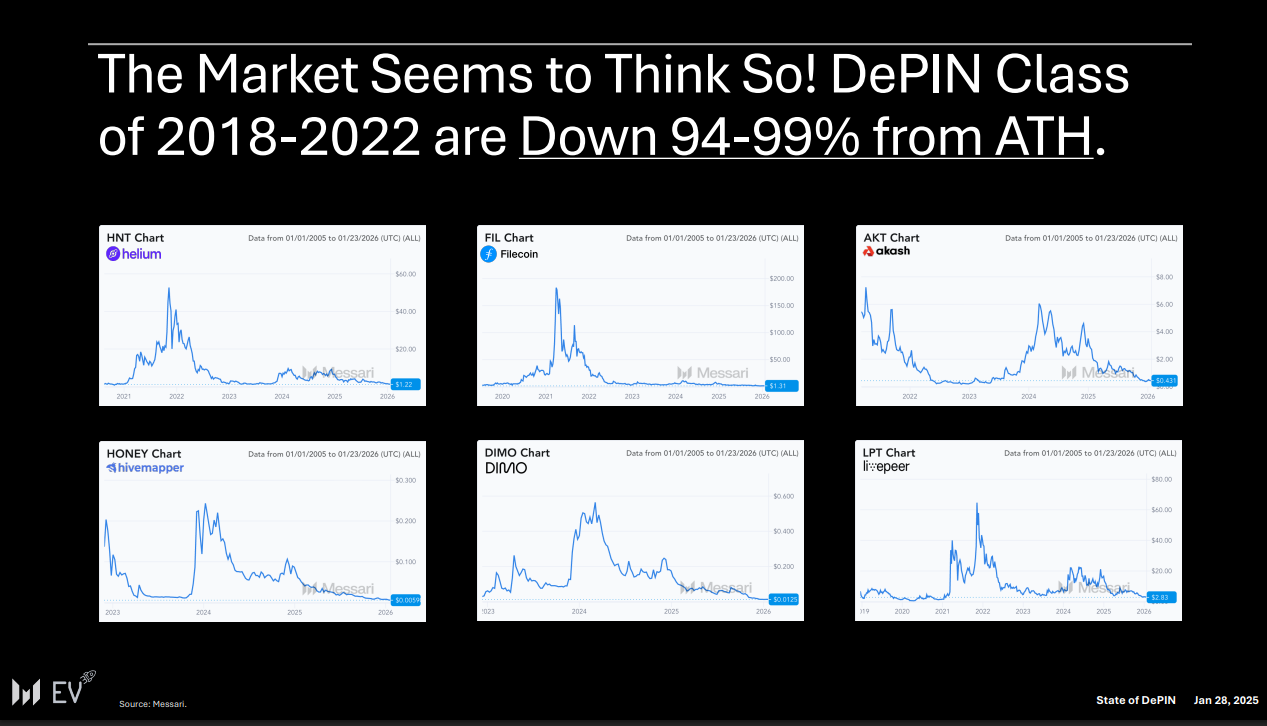 报告显示,2018-2022年间启动的DePIN代币价格较历史高点下跌了94%-99%。然而,领先项目目前已实现可验证的经常性收入,并以约10-25倍的收入倍数进行交易——梅萨里认为,相对于增长潜力而言,这一水平被低估了。