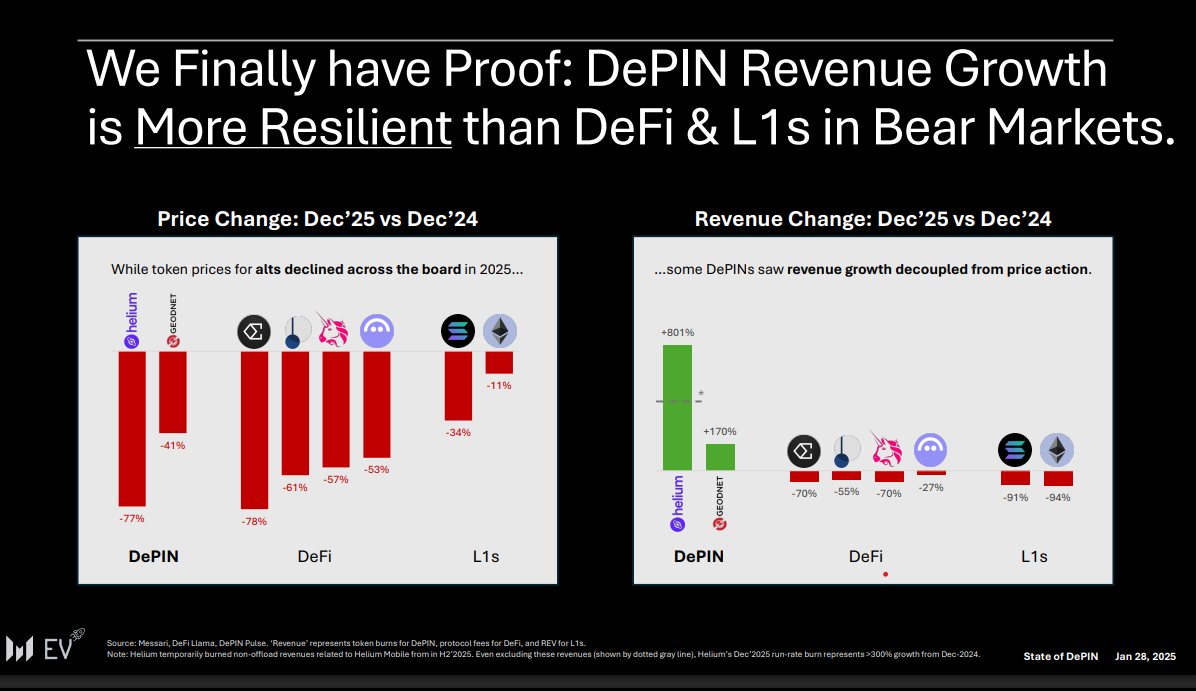 尽管Helium和GEODNET等DePIN代币在2024年12月至2025年12月期间价格分别下跌77%和41%,但其链上收入同期分别增长了约8倍和1.7倍,而领先的DeFi协议和智能合约链的收入则大幅下滑。