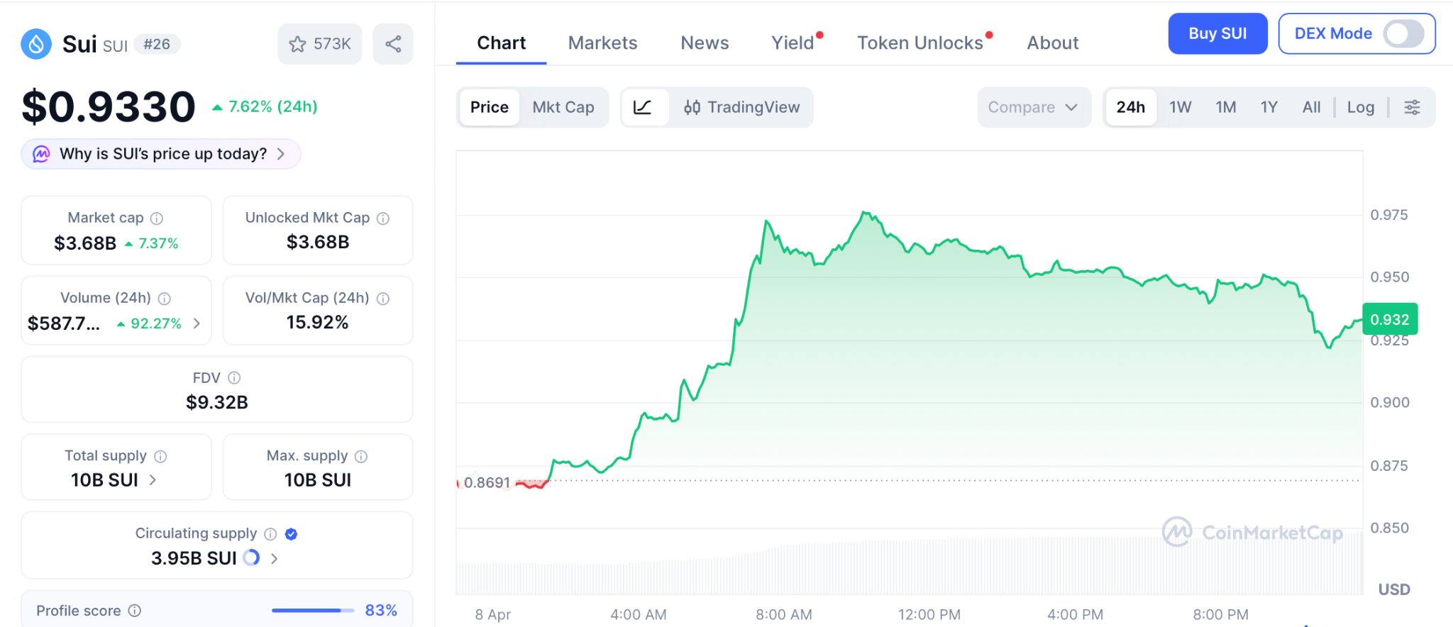 根据CoinMarketCap数据,SUI交易价格约为0.93美元,较其5.35美元的历史高点下跌了约83%,市值约36亿美元。