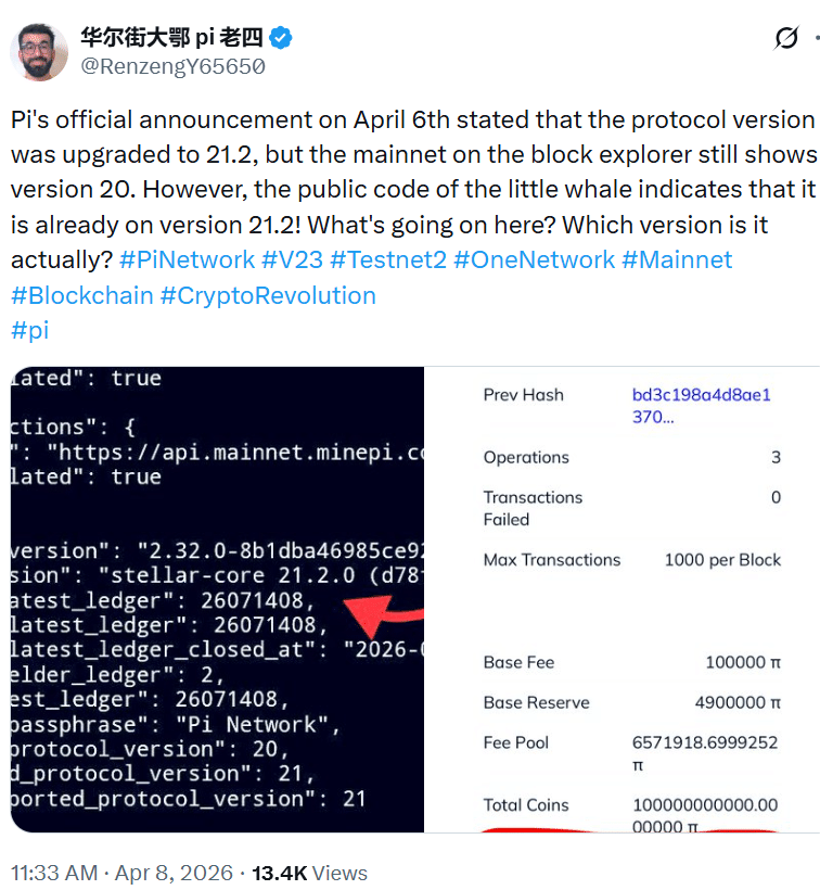 Pi Network发布了新的主网协议更新,但此次发布却在社区中引发了困惑。该项目称已于4月6日将协议从版本20升级至版本21.2。然而,公共区块链浏览器似乎仍显示为版本20。这种不一致对网络的当前状态及更新推进速度提出了新的质疑。