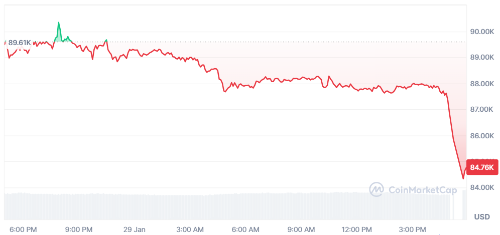 1月29日,比特币价格从超过89,000美元跌至84,000美元区间,过去24小时内跌幅超5%。此次下跌发生在一小时内加密货币市场遭遇大规模清算之际。