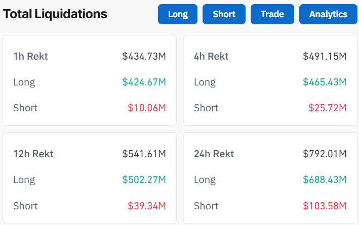 过去一小时内加密货币市场清算总额超过4.29亿美元,推动比特币价格下行。CoinGlass数据显示,该时段内近4.2亿美元多头仓位被清算,空头仓位清算约1000万美元。