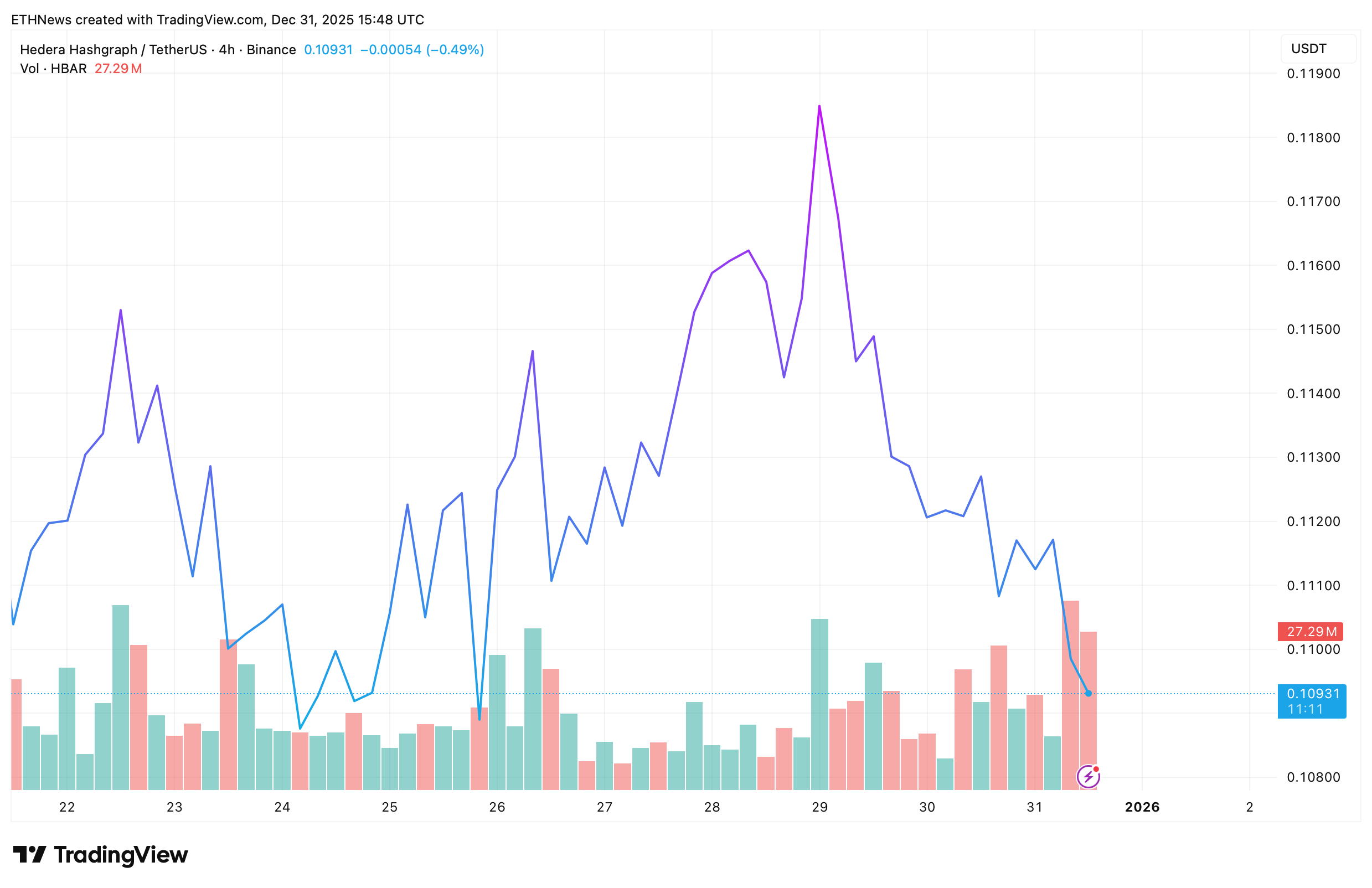 4小时TradingView图表与高时间级别观点形成呼应。2025年12月31日15:50 UTC,Hedera Hashgraph报0.10931美元,日内下跌0.49%,期间交易量为2729万HBAR。