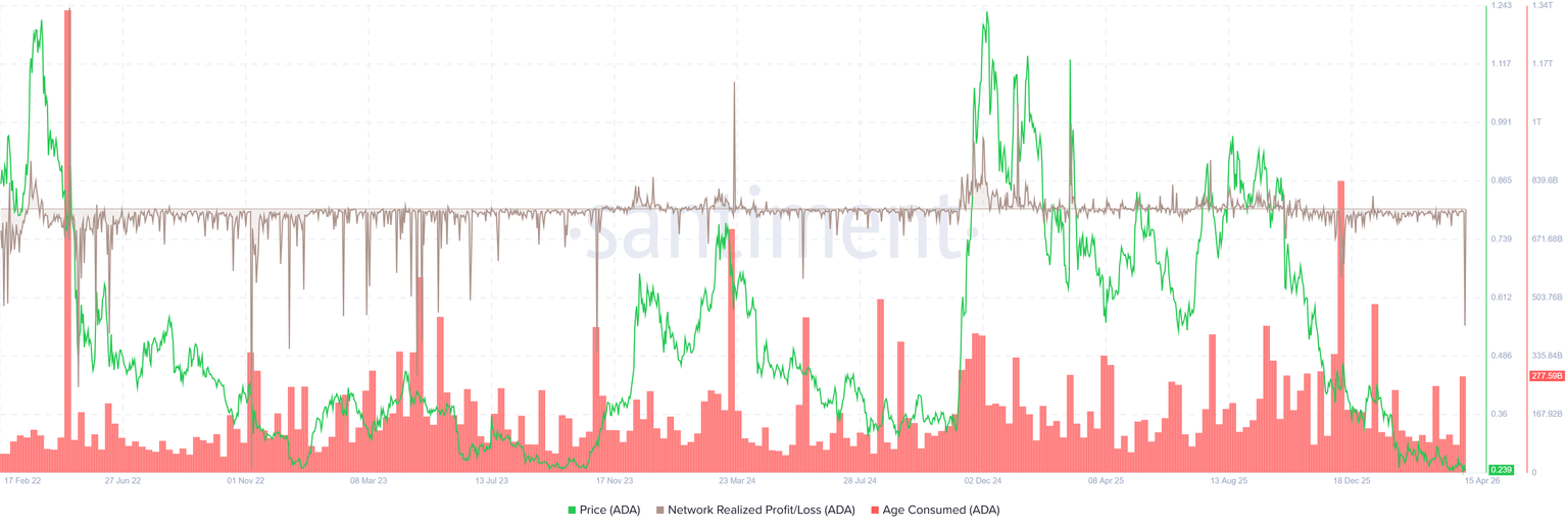 区块链分析平台Santiment已识别出卡尔达诺链上活动的相关模式。周二,网络实现盈亏指标出现显著的负向飙升,表明投资者主要处于亏损卖出状态。同时,已消耗时间指标出现明显峰值,揭示了先前长期闲置的代币已开始重新流通。