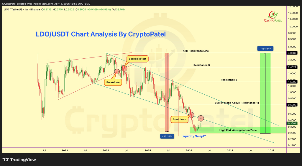 加密分析师Crypto Patel指出,在经历接近93%的宏观修正后,LDO继续在一个高风险积累区内交易。价格仍受制于关键阻力位下方,迄今为止尚未出现任何得到确认的看涨结构突破。