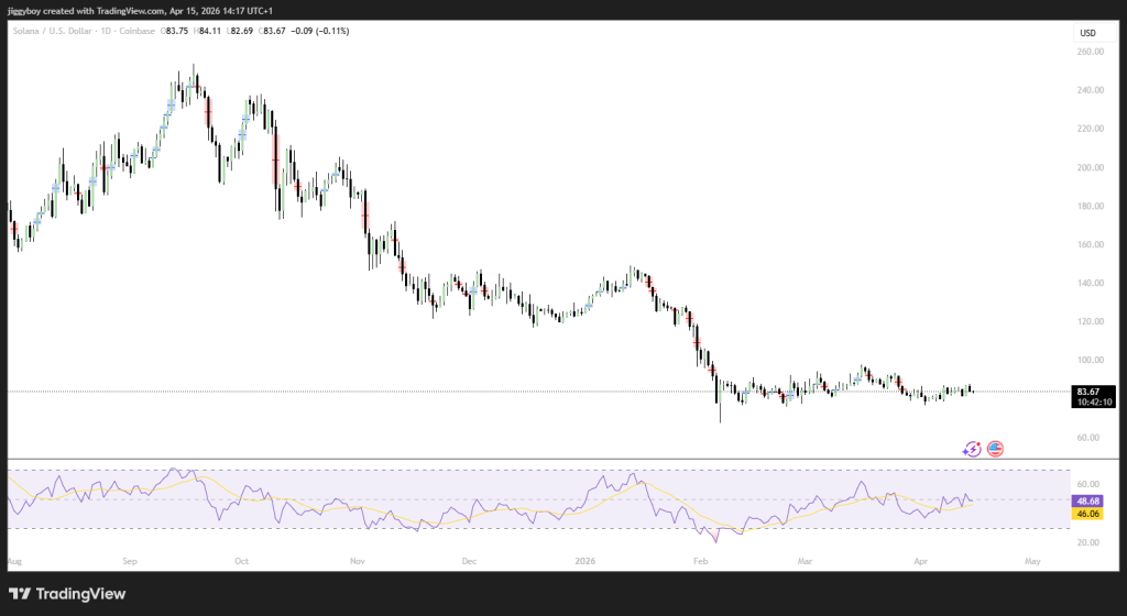 日线图显示,Solana当前价格为83.67美元,日内微跌0.11%,最低触及82.69美元,最高达到84.11美元。整体形势不容乐观:SOL价格远低于260美元的历史水平,图表呈现出自2025年末至2026年的长期下跌趋势。目前83美元附近存在支撑,第一支撑位为60美元,更深层支撑位于48-46美元区间。