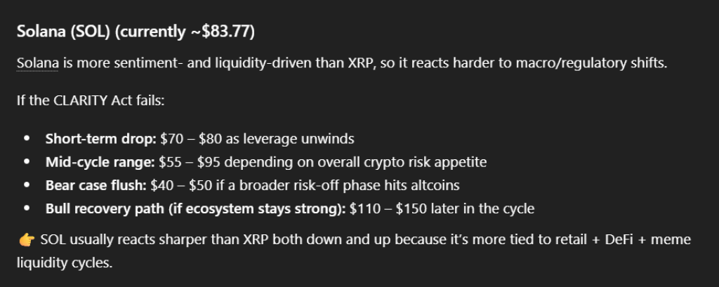 ChatGPT指出Solana比XRP更易受情绪驱动。若《清晰法案》未获通过,其具体价格目标如下:短期杠杆平仓可能使SOL价格跌至70-80美元区间;在持续数月的中期周期内,价格可能根据整体加密货币风险偏好在55-95美元之间波动;若出现全面风险规避情绪冲击山寨币,Solana或进一步下探40-50美元区间。但若Solana生态保持韧性,周期后期有望反弹至110-150美元。因此最可能的目标区间为70-80美元,极端熊市下可能触及40-50美元。