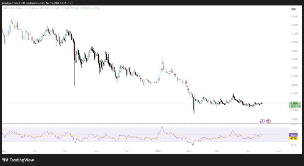 XRP日线图显示当前价格为1.3650美元,日内仅上涨0.18%,最高报1.3695美元,最低至1.3509美元。从图表可见,XRP价格已从3.40美元上方持续下跌,目前围绕1.36美元震荡,前期支撑位分别位于1.20美元和1.00美元,更深层支撑可见于0.80美元、0.60美元乃至0.50-0.45美元区间。