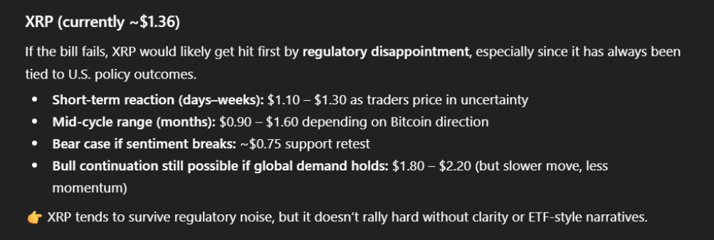 尽管在全球需求保持稳定的情况下,XRP仍可能涨至1.80-2.20美元,但相比法案通过的情形,其反弹力度与速度都将减弱。虽然XRP素有经受监管风波的历史,但在缺乏明确利好或ETF类叙事的情况下难以强势回应。目前最可能的价格区间为1.10-1.30美元。