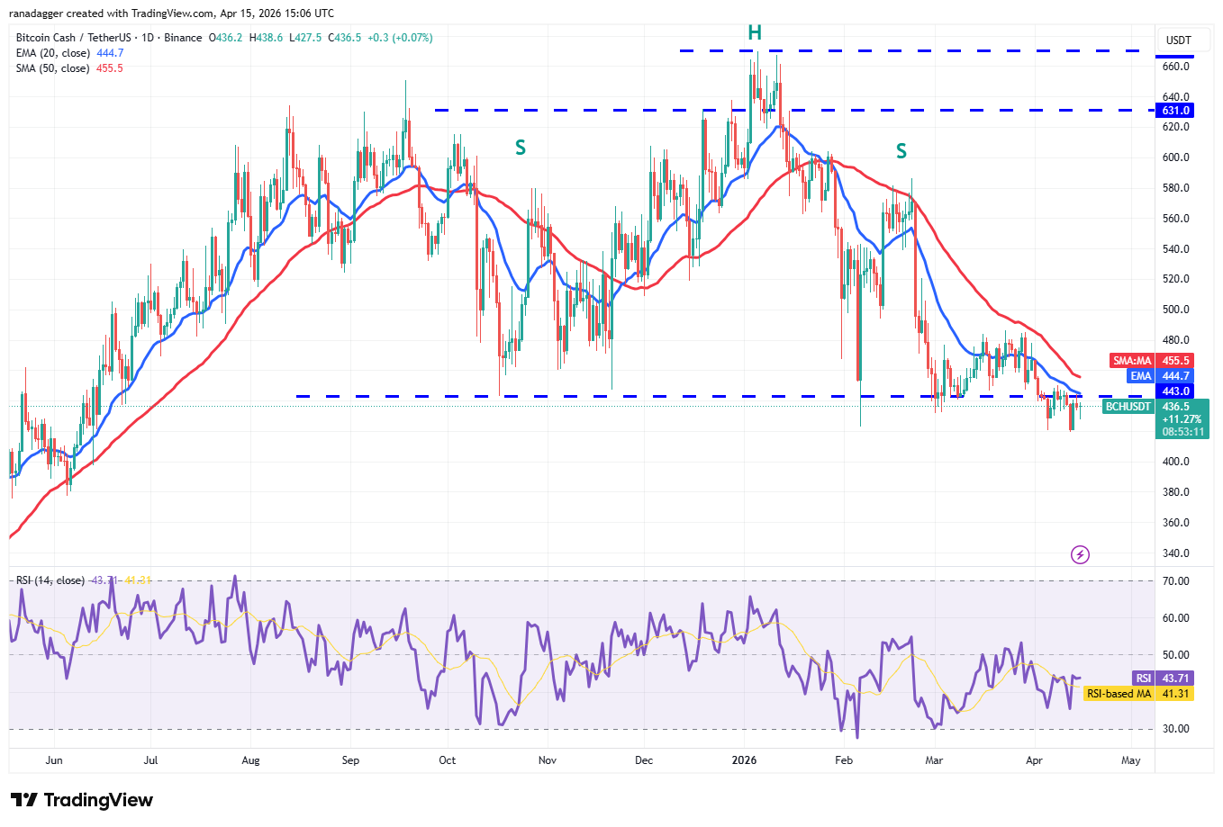 卖盘将努力通过将BCH价格打压至419美元下方来巩固其优势。如果他们成功做到这一点,BCH/USDT交易对可能开启下行趋势,目标指向375美元。