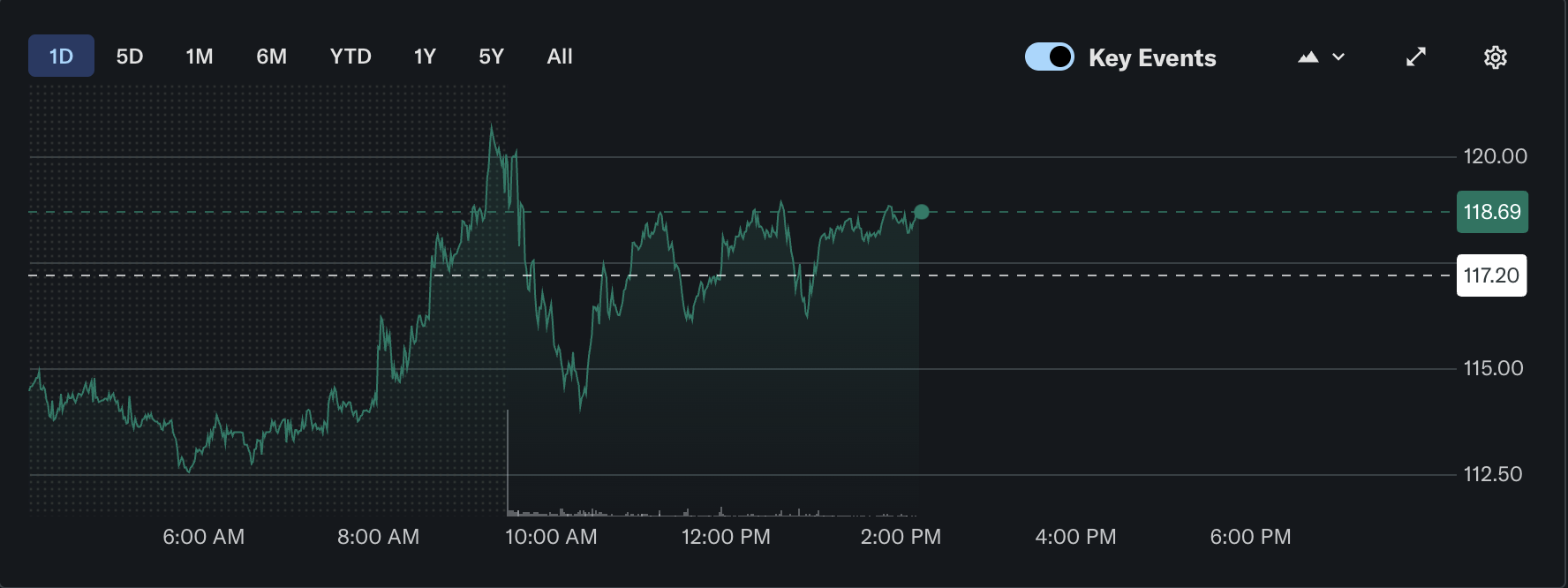 雅虎财经数据显示,周三CoreWeave股价上涨1.5%,截至发稿时已攀升至约119.04美元。