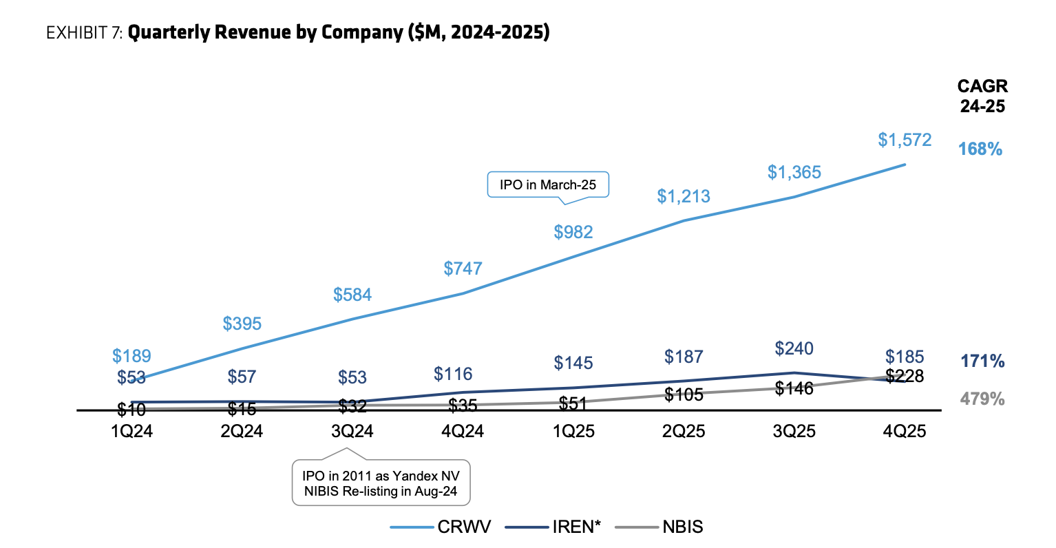 CoreWeave、IREN和Nebius季度收入对比。数据来源:伯恩斯坦