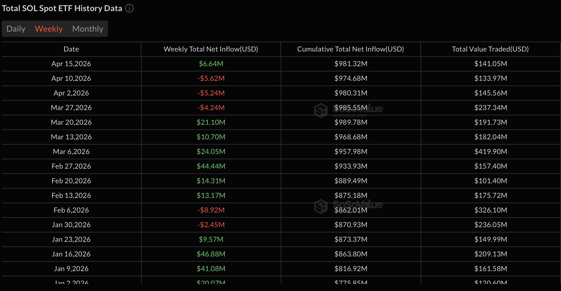在图表形成矩形的同一时期,根据SoSoValue数据,SOL现货ETF的机构资金流入描绘了清晰图景。2月13日当周流入1317万美元,2月20日当周流入1431万美元。随后出现最具说服力的时刻——2月27日当周,即在市场恐慌见底后,机构单周投入4444万美元,这是整个时期最大规模的资金流入。