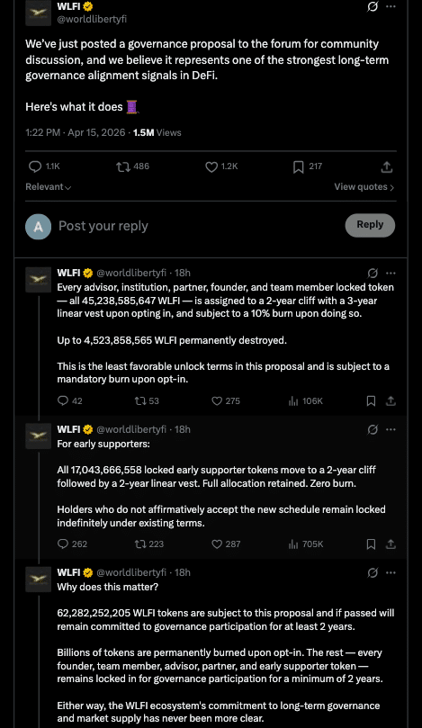 WLFI治理提案计划确实在一个方面取得了成功,即为代币解锁引入了一条更清晰的路径,减少了供应方面的近期不确定性。