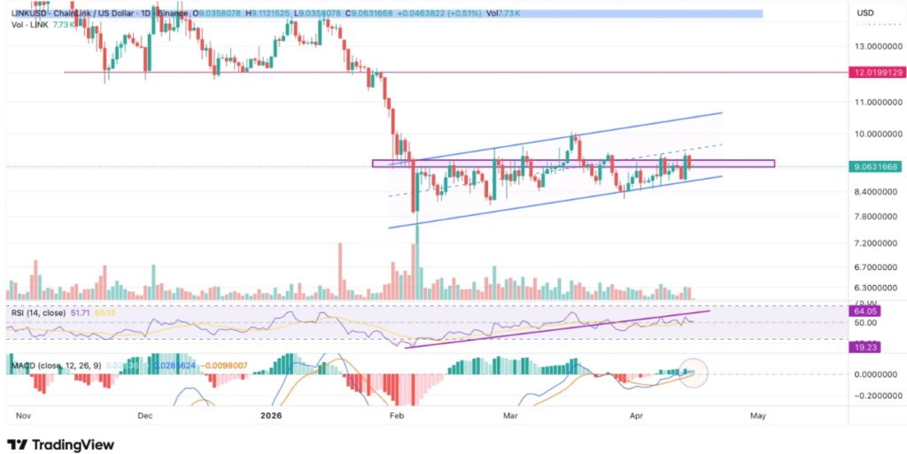 Chainlink价格持续在狭窄区间内交易,在10美元下方趋于稳定,同时保持着稳健的上升结构。该代币价格坚挺地位于8.4美元至9.6美元之间,随着买家在回调中逐步进场,清晰的积累信号已然显现。此外,价格在阻力位附近反复遇阻,证实卖方仍在坚守区间上沿。