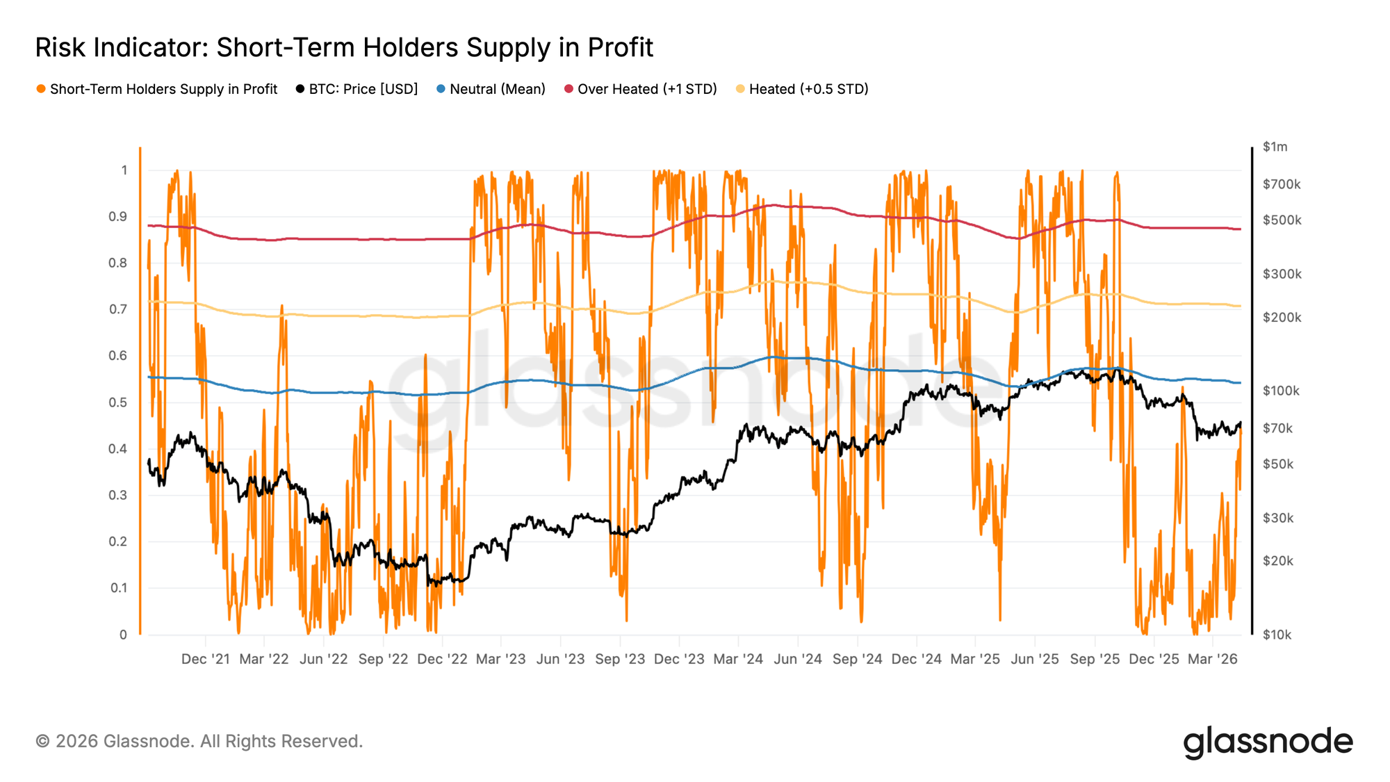 市场分析师表示,比特币(BTC)近期飙升至7.6万美元标志着“明确的动能转换”,确认了BTC价格的短期上涨趋势。Glassnode数据显示,比特币短期持有者盈利供应量(即近期购入且当前处于未实现盈利状态的代币占比)表明,BTC/USD尚未耗尽熊市反弹动能。