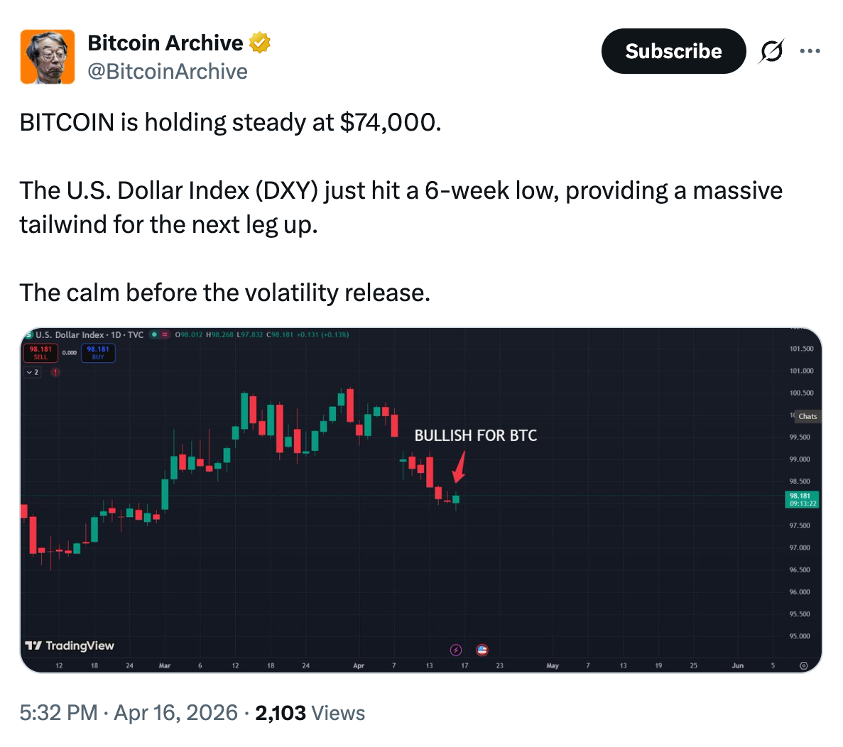 该分析师表示:“结合明确的动能转换与看涨趋势信号,我认为当前应倾向看涨方向。”并补充道:“BTC突破7.4万美元并在高时间框架上保持该水平,将是确认未来数周内有望触及8.5万-8.9万美元区间的最终触发信号。”