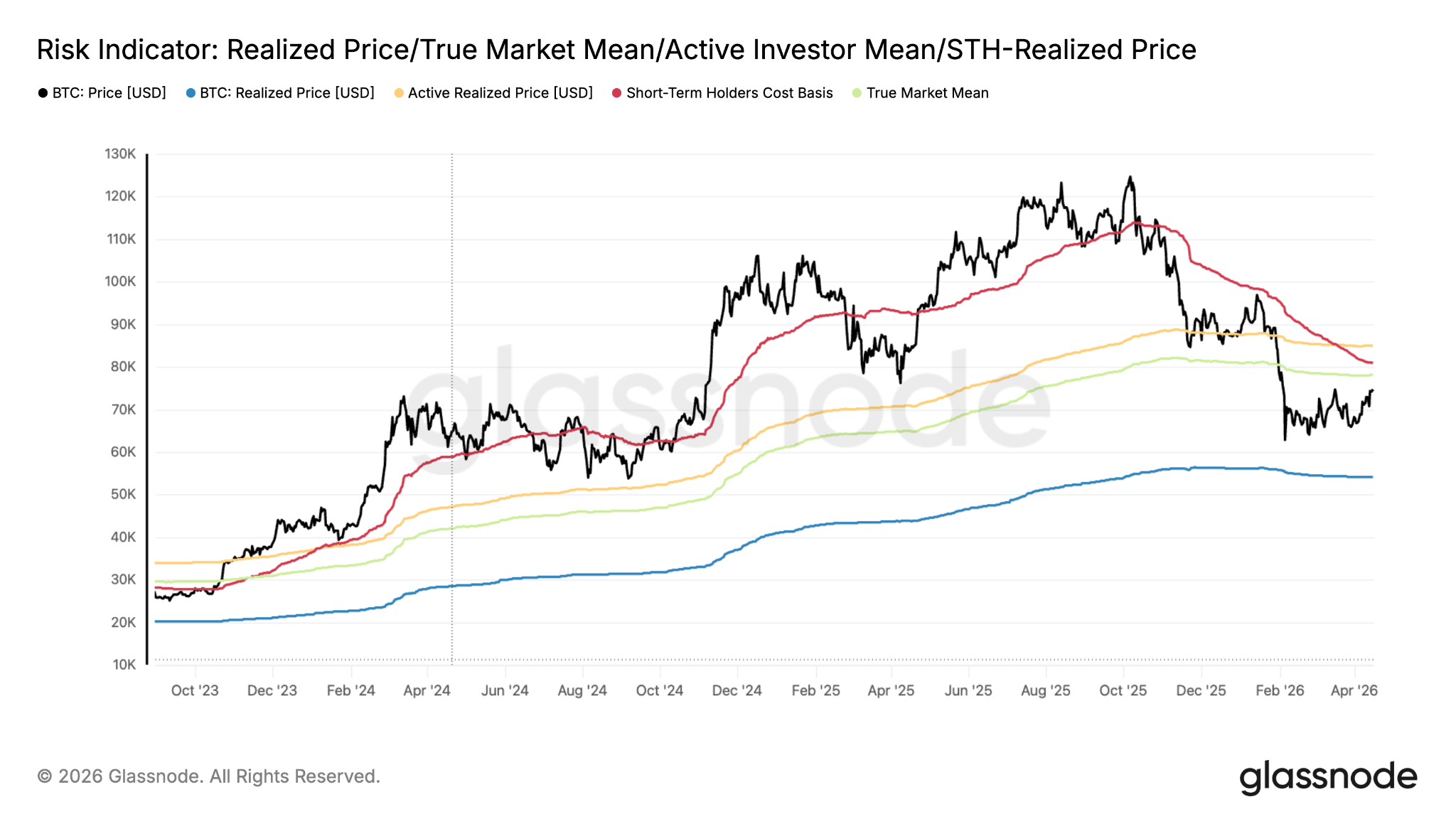 在7.4万美元价位,比特币较真实市场均值(追踪活跃BTC供应成本基础的指标)低5.2%。Glassnode强调,虽然价格尚未“测试并稳定在该关键阈值之上,但中期内价格冲击并可能突破该水平的概率仍然可观。”