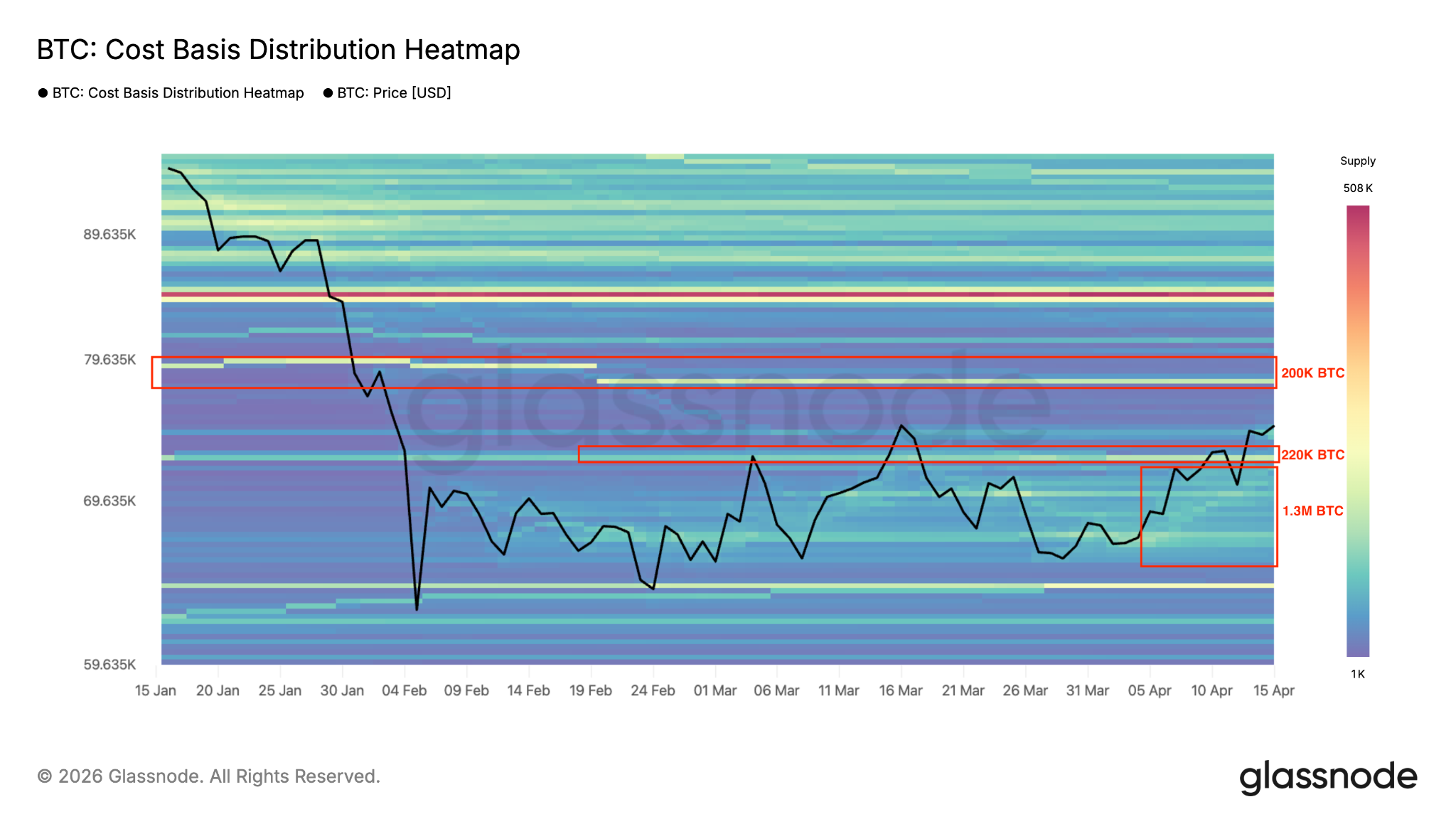 成本基础分布强化了该阻力位的重要性。下方热力图显示,超过20万枚BTC的购入成本集中在7.8万美元附近。